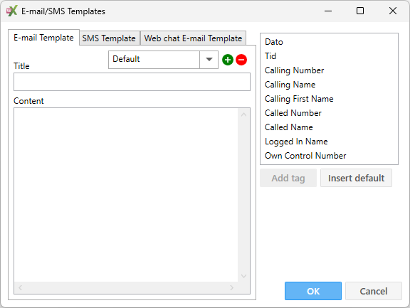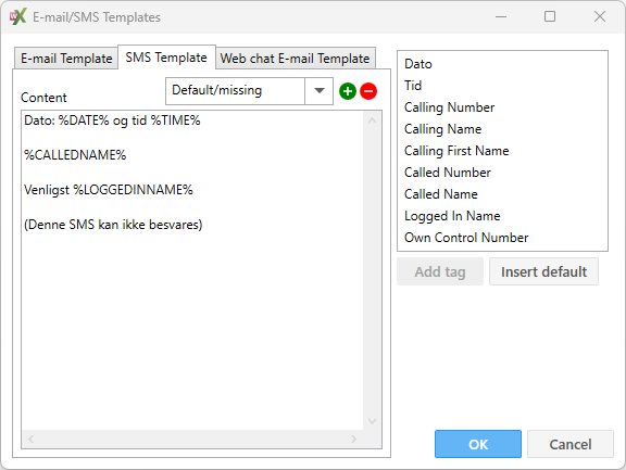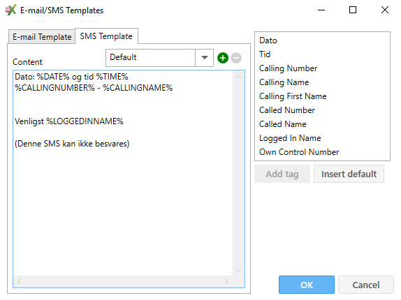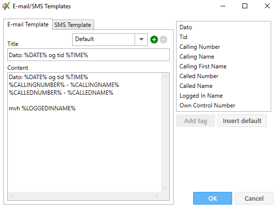 Content | Indtast hvad der skal stå i indholdsfeltet i mailen samt oplysninger om tidspunkt og hvem, der ringer ind. Dette gøres ved at vælge parametrene i højre side og klikke på Add. Parametre vises med % foran og bagved. Disse % tegn må ikke slettes. Ved at klikke på knappen ”Insert default” vil de mest brugte parametre blive tilføjet | |||