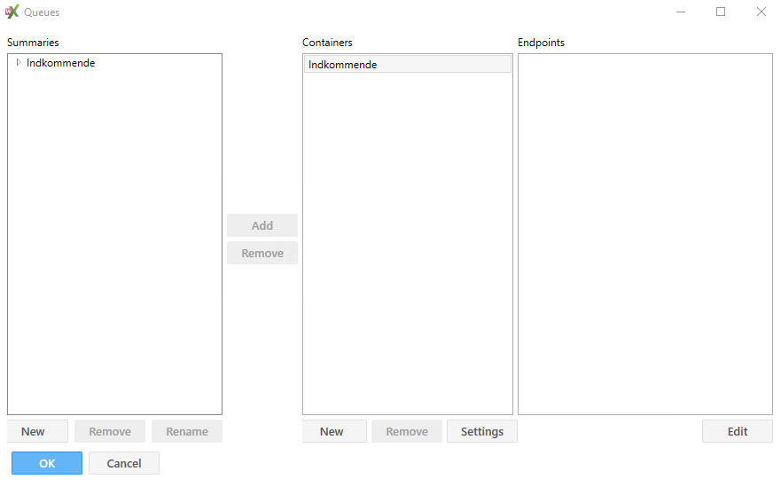 Summaries | Her kan en samling af Queue Summaries og Queue containers konfigureres. Først skal der dog være et antal Queue containers til stede. Når der er tilknyttet nogle Queue Containers til f.eks. indkommende Summary, vil opkald til de kø’er blive vist øverst til venstre i Miralix Office Operator i F1 feltet som en ”Bar” ud for ”indkommende”. Opkaldene vil også blive vist i Queue Container nederst i Miralix Office Operator F1 felt. Obs! Der kan max. være 5 Queue Summaries i Miralix Office Operator | |