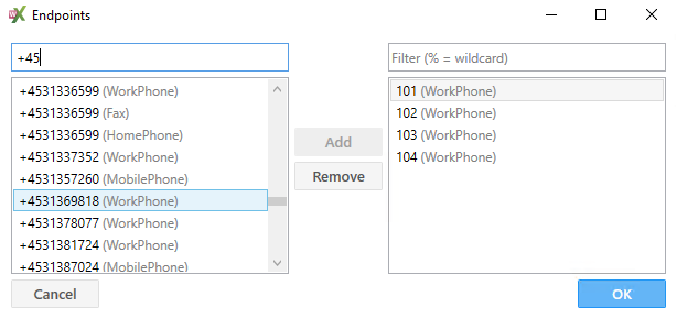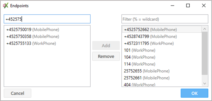 Select endpoints | Vis alle enheder, der er oprettet, og som kan vælges til Endpoint(s) listen (figur 87). ![]() Figur 87 Tilføj numre på listen ved at markere dem i venstre kolonne og klik på Add. Fjern numre fra listen ved at markere dem i højre kolonne og klik på Remove Klik på OK efter endt konfigurering. | |||||