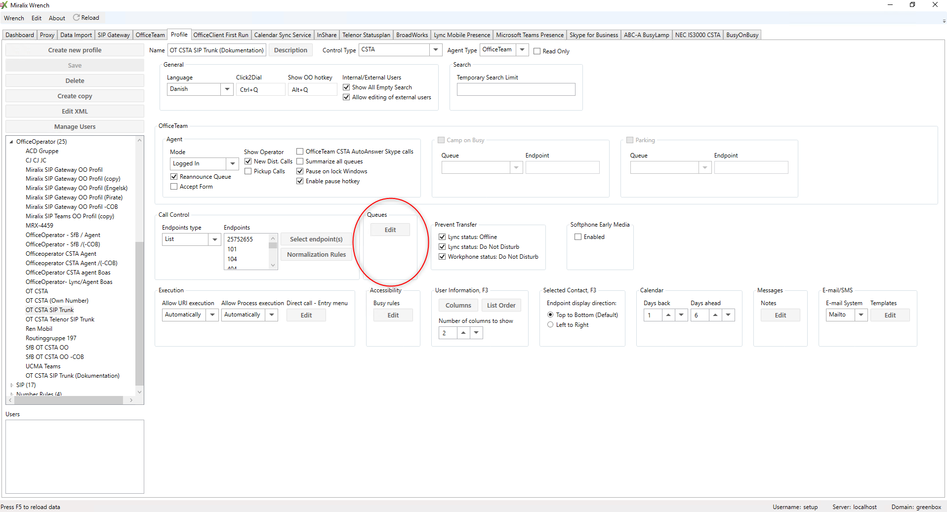En profil kan være tilknyttet flere brugerkonti. For SIP profiler er det dog Miralix Greenbox Editor, som skal benyttes, her tilknyttes SIP profiler til kontakt slutpunkter.
