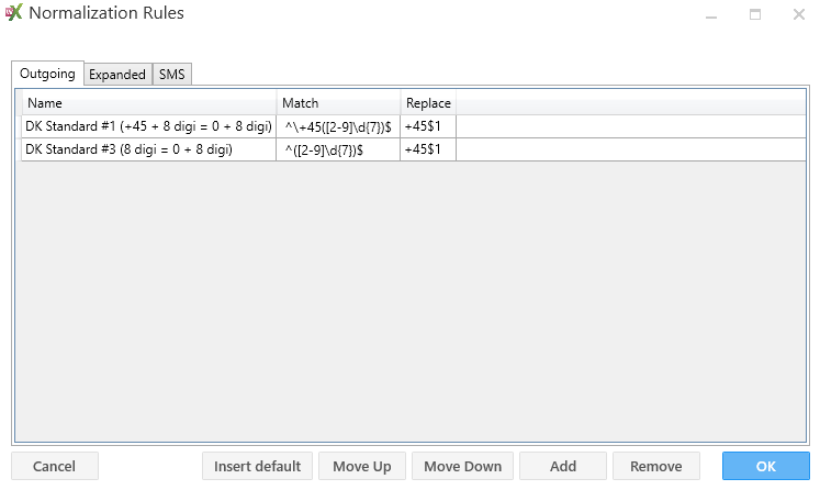 Expanded | Normaliseringsregler for ”Nummer til Navn” og søgning. Bruges til at vise navnet i Klienter på den, der ringer ind og søgning i klient. | |||
