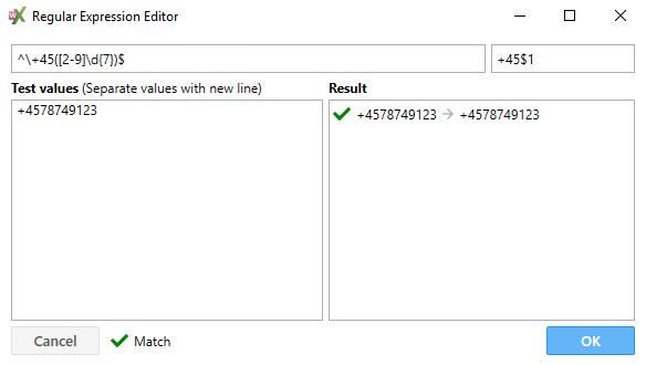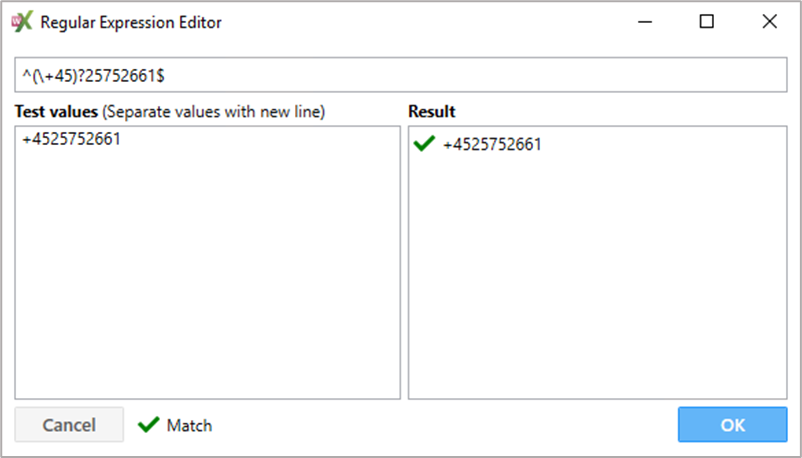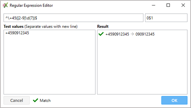 ![]() Figur 88 Reglerne kan editeres ved at dobbeltklikke på feltet, som ønskes ændret (figur 89). Markeres en af reglerne bliver ”Move Up” og ”Move Down” knapperne aktive, og det er muligt at flytte en regel op eller ned. Dobbelt-klikkes der på et felt i ”Match” kolonnen, vises Regular Expression Editor, hvor resultatet også kan testes. Når der er indtastet et nummer i feltet ”Test values” som matcher reglen vil der i feltet ”Result” blive vist et grønt flueben ud for det nummer som er indtastet og derefter vises det ”normaliserede” nummer (76410900) ![]() Figur 89 | ||||||