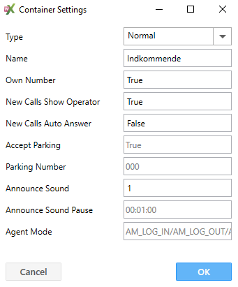 Containers | Containers er i princippet kø’er, hvor der er tilknyttet et telefonnummer. New: Klik på New for at oprette en ny Container (kø) Remove: Klik på Remove for at fjerne en Container | |