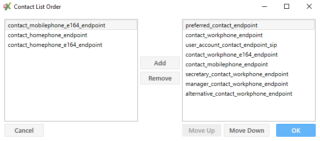 Contact Endpoints | Hvilke numre som skal benytte SIP phone via denne profil Obs! Denne indstilling benyttes kun hvis der skal være flere SIP profiler, ellers benyttes indstillingen ”Service Endpoints”. Kan også foretages i Miralix Greenbox Editor under fanen Kontakt Slutpunkt\Service\Type som skal sættes til SIP. Ved at klikke på knappen ”Contact Endpoints” åbnes et nyt vindue. Markér numrene i venstre side og klik på Add. For at slette numre, markér numrene i højre side og klik på Remove. Klik på Ok for at afslutte |