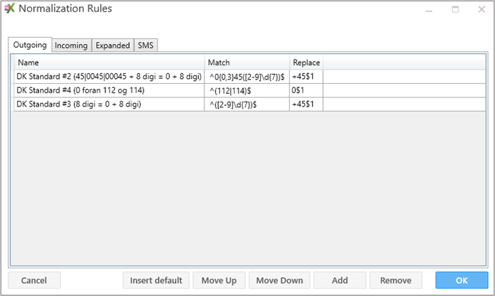 Expanded | Normaliseringsregler for ”Nummer til Navn” og søgning. Bruges til at vise navnet i Klienter på den, der ringer ind og søgning i klient. | |||||