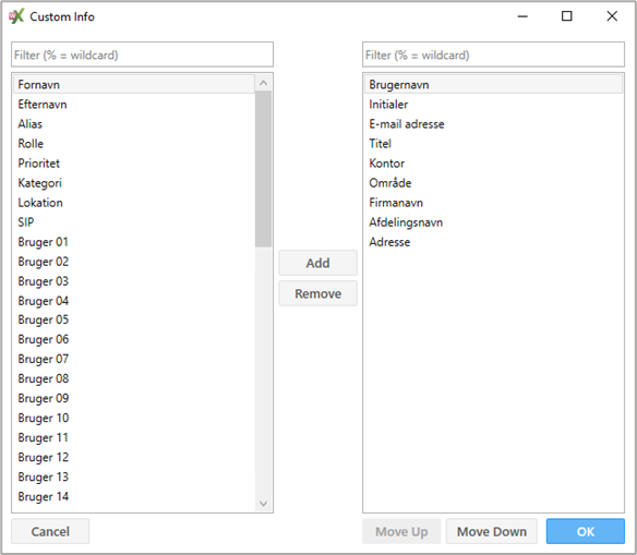 Custom Info | Klik på knappen og nyt vindue vises, hvor der kan vælges hvilke brugerfelter, som skal vises i Miralix Desktop klienten | |||
