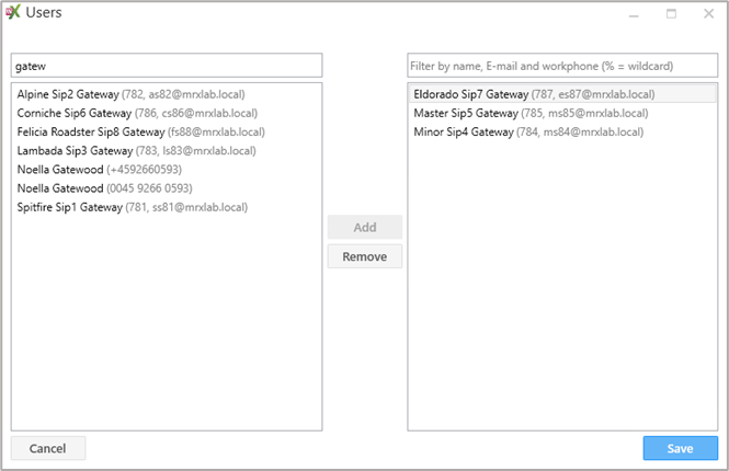 For at tilføje en bruger vælges denne på listen til venstre og der klikkes på Add. Der kan også dobbeltklikkes på en bruger for at tilføje denne. Ligeledes fjernes en bruger fra listen til højre ved at vælge brugeren og klikke på Remove (eller dobbeltklik). Når der er valgt de ønskede brugere, klikkes på Save.