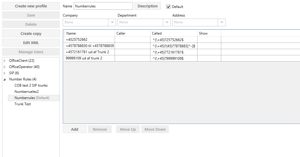 Move Up/ Move Down | Her kan den markerede regel flyttes op eller ned i hierarkiet, forstået på den måde, at jo mere detaljeret ”Caller” og ”Called” er defineret, des højere skal den prioriteres. Eks.: Er der defineret 2 regler, en med ^\+4576 i ”called” og en med ^\+45, skal reglen med ^\+4576 stå højere end ^\+45 |
