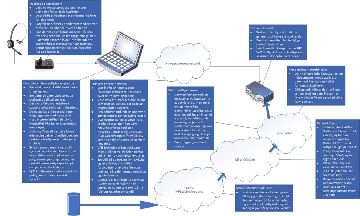 Den vedhæftede illustration viser, hvordan forskellige faktorer som headset, firewall og netværksforbindelse bidrager til samtalekvaliteten ved brug af Miralix Softphone. Sørg for at have alle krav opfyldt for optimal performance.